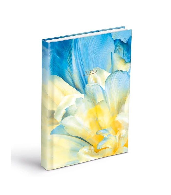 Denní diář pro rok 2025 ve formátu A5 s elegantním romantickým květinovým motivem v tónech modré, žluté a bílé. Povrch obálky je vyroben z lesklého lamina, což dodává diáři luxusní vzhled a zvyšuje jeho odolnost.