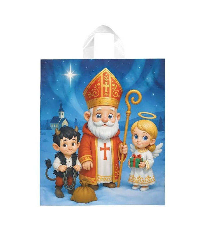 Celoplošně potištěná igelitová taška s Mikulášským motivem a navařeným uchem. Na tašce jsou obrázky Mikuláše, anděla, čerta a vánočních dárků.