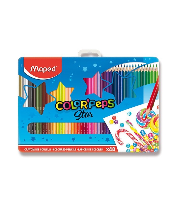 Soupravu 48 kusů pastelek v odolném kovovém pouzdře s veselým designem využije každý školák. Pouzdro je odolné proti nárazům, chrání pastelky proti poškození. Ergonomické pastelky Maped ColorPeps mají trojhranné tělo, měkkou odolnou tuhu a jasné barvy.