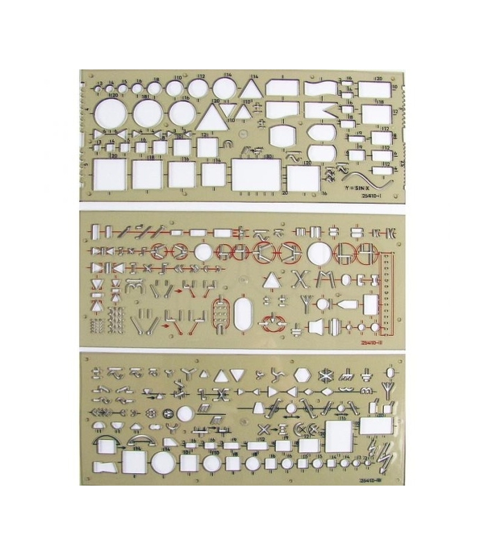 Souprava je ideální pro použití ve škole i v kanceláři. Šablony jsou zabaleny do polypropylenového pouzdra s potištěnou papírovou vložkou.