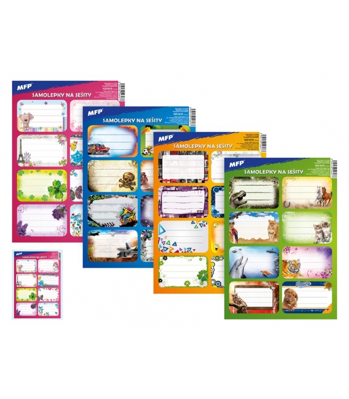 Samolepky na sešity, aršík obsahuje 8 různých motivů samolepek k polepení sešitů. Každá samolepka obsahuje 4 řádky, kde můžete například napsat jméno a příjmení, předmět, název školy, třídu.