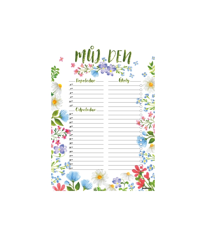 Detailní rozvržení dne pro ty, kteří chtějí mít pod kontrolou každou hodinu. Vhodný pro pracovní vytížení, studijní plán nebo denní rutinu. Kombinuje časový harmonogram s místem pro úkoly i poznámky.