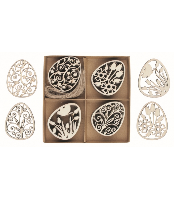 Vajíčka vyřezávaná dřevěná, 4 × 5,5 × 0,2 cm, 16 ks v krabičce