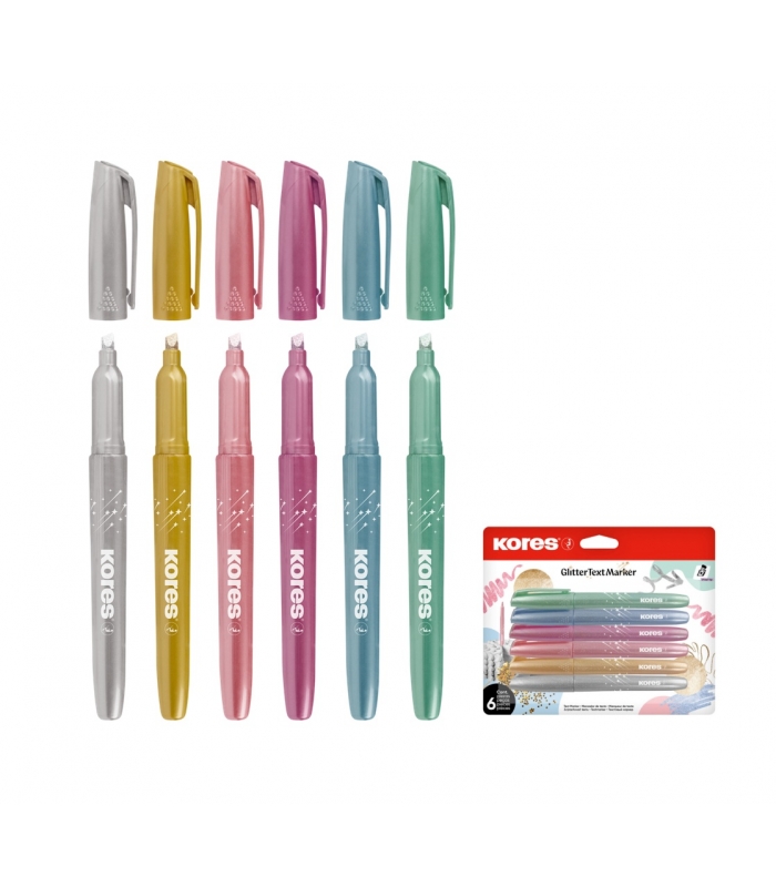 Třpytivé zvýrazňovače/ popisovače sada 6 barev jsou určeny pro plynulé zvýrazňování textu a dekorativní popisování na všech typech papíru. Jemný třpytivý inkoust dodá textu decentní lesk při zachování jeho čitelnosti.